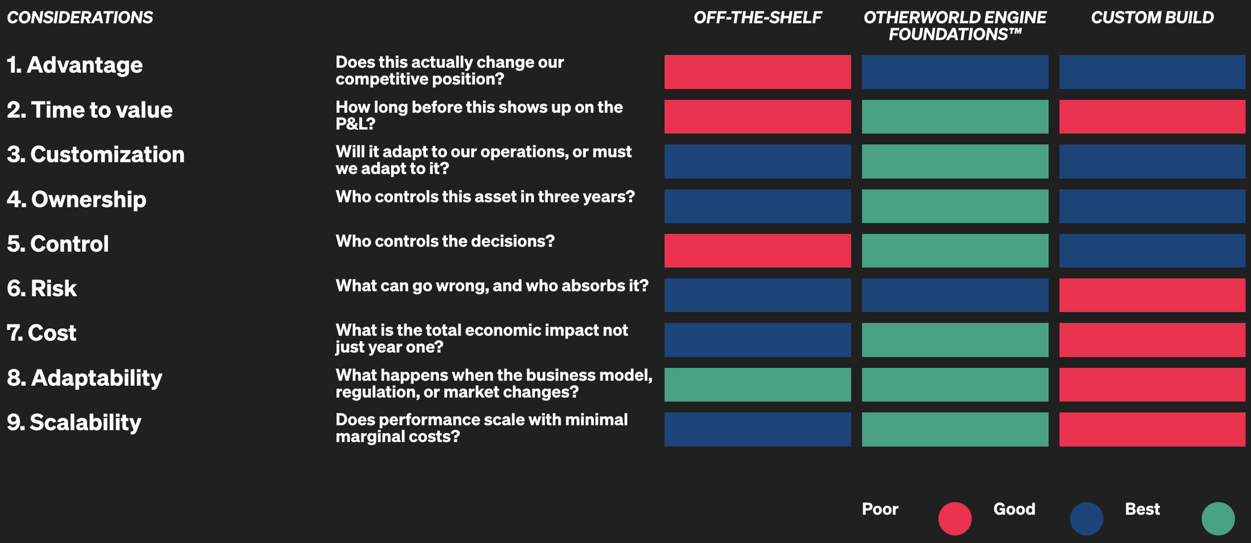 The market forces a trade-off. Commodity SaaS limits advantage to incremental gains. Full custom builds increase cost, delay time-to-value, and add risk. Otherworld Engine™ delivers performance without the extremes and breaks the trade-off.